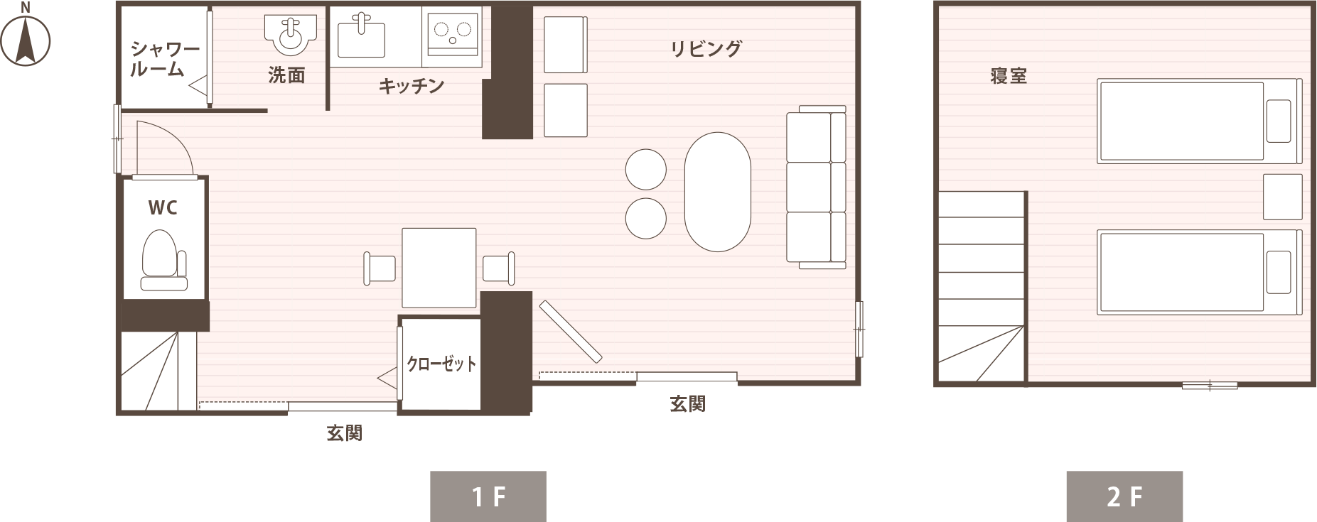 1階にリビングやダイニングなど寛ぐスペース、2階は寝室となっています。